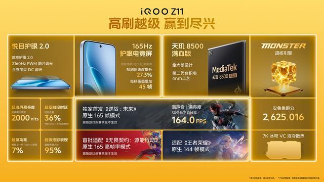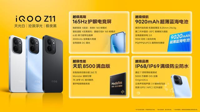 iQOO Z11按期发布,中枢卖点是天玑8500和9020毫安时大电板,还有165Hz电竞直屏和丰富的外围设立,8GB+256GB版国补价1699元。和竞品红米Turbo5比较性价比稍低,上风是大电板和165Hz电竞大屏,还有自研的Monster超核引擎和满级防水耐摔机身等等。