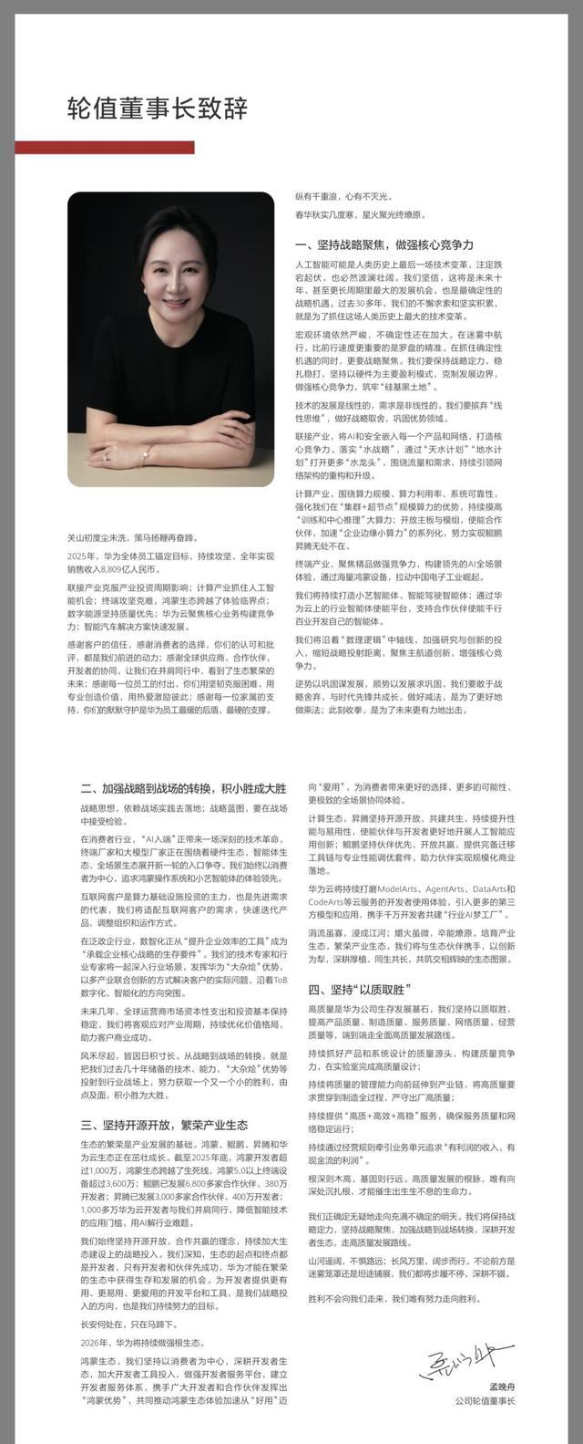 华为2025年的年度论述,以公司轮值董事长孟晚舟节略致辞开篇。笔墨莫得口吻,却能传递出幽静和刚毅。